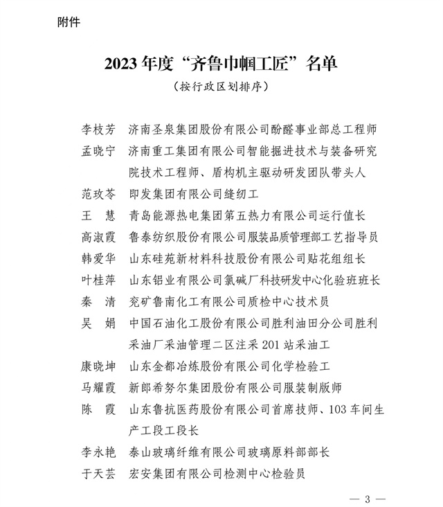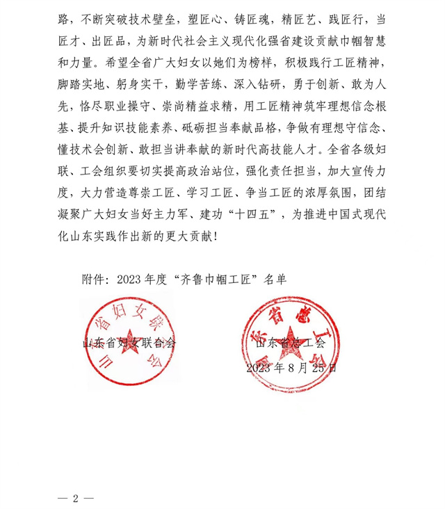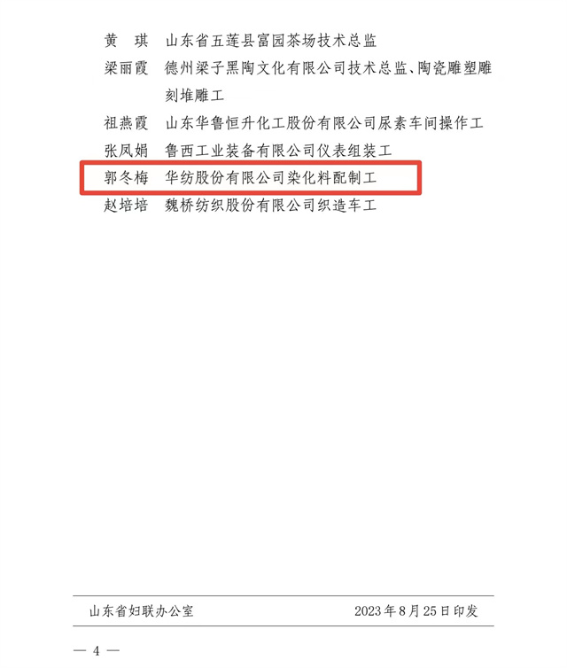 為大力弘揚勞模精神、勞動精神、工匠精神,努力建設知識型、技能型、創新型女性勞動者大軍。近日,山東省婦女聯合會、山東省總工會發布了“關于公布2023年度‘齊魯巾幗工匠’的通知”,公司染化料配制工郭冬梅名列其中。