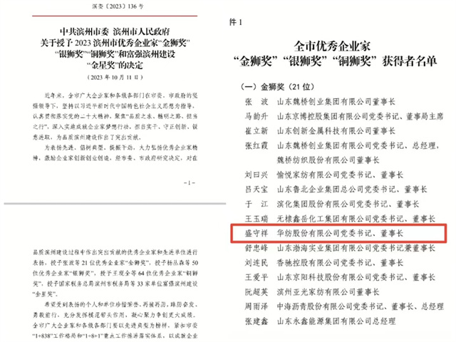 據了解,這是公司連續五次榮獲濱州市優秀企業家“金獅獎”榮譽,作為濱州市五大千億級產業集群中智能紡織板塊的重要組成部分,公司積極打造“數字華紡”,完成智能綠色工廠項目,改變了傳統的管理思維定式,為傳統產業通過現代科技手段改造獲得有益的嘗試與探索,成為行業智能化印染工廠新標桿;在市場方面,公司積極擴大國外市場,開拓國內市場,把握國內國際最新市場動態,優化產品結構,準確市場定位,提高產品市場競爭力,實現國內國外雙循環;在技術創新方面,以“做好自己的事情”為前提,不遺余力地推動公司科技進步與創新,堅持依靠科技創新提升企業的核心競爭力,持續做好新技術、新工藝、新產品的研究和應用,充分發揮“八大科研平臺”作用,不斷形成新理論、新工藝,增強持續創新的能力。