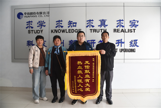 4月8日,服裝車間員工房虎收到了一面飽含深情的錦旗,上面寫著“無償獻血有大愛,熱血救人暖人心”。這面錦旗不僅是對房虎長期堅持無償獻血善舉的高度認可,更彰顯了華紡人熱心公益、奉獻社會的精神風貌。